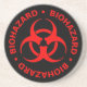 dessous de verre en grès noir avec un symbole de danger biologique rouge et un texte d'avertissement.