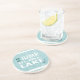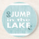 Les dessous de verre "assoiffés" ronds de boissons de grès avec la citation, "vont saut dans le lac" avec l'arrière - plan en bois patiné bleu-clair. Ancre et lettrage de bulle.