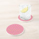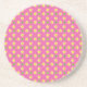 Un dessous de verre rond, en grès ou en natte, avec un motif de primroses jaunes et de pois verts sur un arrière - plan rose profond : une partie de la collection Posh & Painterly 'Primroses'.