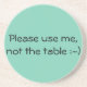 Les dessous de verre indiquent, satisfont m'emploient, pas la table. Une manière gentille de rappeler l'invité de ne pas placer un verre humide, tasse, peut ou quoi que, sur la table.