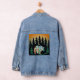 Cette veste en jean unique présente une silhouette d'une pinède. Devant se trouve un grand ours errant dans la forêt. Il a été créé comme une silhouette noire avec une aquarelle orange, rouge et verte pompeuse dans l'arrière - plan. Le skyline a le même arrière - plan vibrant, avec des étoiles scintillantes en feuille d'or.