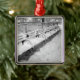 Une scène de parc enneigé lors d'une soirée hivernale. Des bancs couverts de neige s'éloignent dans une image en noir et blanc qui fait un ornement parfait de Noël ou tout garde-temps.