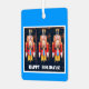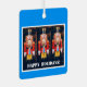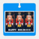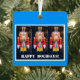 L'ornement de Noël de Noël montre la photo de la figure traditionnelle de la noisette et les mots, "Joyeuses fêtes". Le texte est personnalisable. métal carré avec cintre à ruban rouge.