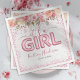Mignonnes serviettes en baby shower de fille avec un arrière - plan blanc simple, élégante parties scintillant scintille & confetti, jolies fleurs d'aquarelle rose, le dicton "c'est une fille", le nom de la future maman, et la date de la célébration.