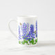 La conception originale de beaux-arts du delphinium ou les fleurs et les papillons de pied-d'alouette par l'artiste Carolyn McFann du studio de ronronnement de deux chats a imprimé sur une tasse de porcelaine tendre de qualité pour des fans de fleur de jardin.