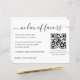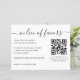 Voici notre carte mariage exquise ! Conçu avec un script noir minimaliste et élégant, cette carte enchanteresse porte un message sincère. Invitant chaleureusement vos invités à prendre part à votre initiative "Au lieu de Faveurs", il symbolise l'importance de rendre en retour. Découvrez le mélange parfait d'élégance intemporelle et de technologie de pointe. Notre carte intègre un code QR personnalisé, vous permettant de créer une expérience unique et interactive. Entrez simplement l'URL de votre code QR, et regardez vos invités immergés dans l'impact de votre cause choisie. L'utilisation d'un code QR sur une carte "au lieu d'une carte de faveurs" peut varier en fonction de vos intentions et objectifs spécifiques. Voici quelques objectifs communs pour l'utilisation d'un code QR dans ce contexte : 1- Fournissez des informations : Avec une simple analyse, vos invités peuvent accéder à des détails supplémentaires sur la cause que vous supportez. Découvrez sa mission, comprenez l'impact qu'elle engendre et apprenez comment leurs contributions seront utilisées. Laissez-les se lancer dans un voyage de connaissance et d'inspiration. 2- Diriger les invités vers une page de don : Grâce à la puissance du code QR, les invités peuvent contribuer de manière transparente à votre organisme de bienfaisance ou à votre cause. En établissant un lien direct vers une page de don, il simplifie le processus et leur permet de faire une différence significative. 3- Partagez des histoires ou des témoignages : Plongez dans les récits personnels qui éclairent l'importance de votre cause. Liez le code QR à des vidéos ou des sites web présentant des histoires touchantes, des témoignages sincères et des expériences inspirantes liées à la cause que vous soutenez. Que leurs coeurs soient bougés et leurs esprits élevés. Tous les styles, couleurs et tailles de texte peuvent être modifiés selon vos besoins. Si vous avez besoin d'aide ou d'articles correspondants, n'hésitez pas à me contacter.
