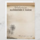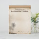 En-tête de bienvenue mariage avec dessins de palmiers vintages et composition de style de billet. Écrivez ici votre message de bienvenue pour vos invités.
