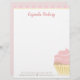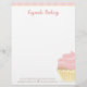 Un joli en-tête pour une boulangerie à rayures roses et un cupcake glacé rose comme filigrane dans une tasse muffin jaune. Personnalisable avec votre nom d'entreprise et des informations et idéal pour les boulangeries qui vendent des cupcakes, des gâteaux, des desserts et d'autres, comme la vente de gâteaux, qui veulent un cupcake comme leur marque en papier-lettres.