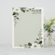 White Flowers with green leaves and stems hold the corners of a sage-green center space on this beautiful and elegant stationery. Perfect for correspondence, invitations, flyers, and more.