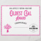 Ayez de l'amusement et distribuez cette récompense de gallon la plus ancienne à votre cérémonie de récompenses de réunion de famille. Le rose, noir et blanc avec le regard affligé inclut un arbre généalogique avec un coeur et un logo de réunion de famille. Écrivez dans le nom de gagnants de récompense, ajoutez votre nom de famille, année d'événement et emplacement de l'événement. Souvenir gentil de souvenir de réunion de famille.
