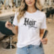 T-shirt de coiffeur personnalisé pour salon de coiffure avec une belle typographie et votre texte personnalisé sur le devant et le dos. Caractérisé par une typographie moderne de style script blackletter sur un t-shirt blanc classique. Un panneau d'affichage ambulant pour votre marque. Une suite d'identité de marque complète est disponible, conçue pour avoir une apparence cohérente, se sentir alignée et élever votre entreprise dès le premier jour. Tous les éléments de cette collection sont conçus pour être facilement personnalisables. ©Marisu Valencia