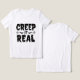 Express vos vibes éffrayantes avec ce t-shirt de typographie "Creep It Real" amusant et moderne. Doté d'une lettrage ludique et de subtiles décorations en toile, ce design simple est parfait pour les amateurs d'Halloween qui veulent un mélange d'humour et de style.