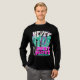 The design is a masterpiece of modern "glitch" and Y2K-inspired typography. The word "NEVER" is rendered in a sharp, white jagged font, while a massive, stylized teal "STOP" dominates the background. The call to action, "JUST MOVE," anchors the bottom in a bold, vibrant pink serif font.