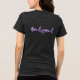 Bachelorette t-shirts for the ladies of the wedding party. Black, short sleeve tee shown, with lavender name, bright pink party title and a tropical design. Include the title of the woman on the back, "Bridesmaid", etc., or remove the sample wording to order shirts with nothing on the back. A collection of yummy cocktails sit amongst hibiscus, anthurium and green leaves. A perfect design for a cocktail party to celebrate the bride. Choose any t-shirt color and style.