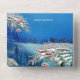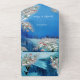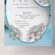Une scène de fantaisie hivernale bleue avec un cadre géométrique doré et de la neige fraîchement tombée dans un décor de pays merveilleux hivernal est facile à personnaliser avec votre texte pour le couple de mariés.