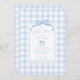 Faites-vous plaisir avec notre délicieuse invitation, avec un motif bleu en vichy cottage. Cette pièce élégante présente un arc coquette et un charmant cheval à bascule. Parfaitement conçue pour donner un ton sophistiqué à votre événement, cette invitation ne se contente pas de transmettre votre joyeuse occasion mais ajoute une touche d'élégance intemporelle que vos invités adoreront. Faites votre baby shower inoubliable avec cette magnifique invitation qui reflète à la fois le style et la grâce.