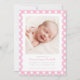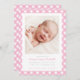 Annoncez l'arrivée de votre petit au monde avec cet adorable faire-part de naissance rose et blanc en vichy. Il dispose d'une seule photo ainsi que d'un espace pour toutes les informations concernant votre arrivée. L'arrière de la carte est muni d'un motif de en vichy rose correspondant.