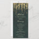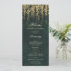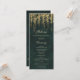 Une aquarelle fantaisie illustrant le feuillage luxuriant et les branches d'arbres recouvertes d'or (effet numérique, pas de véritable feuille) sur un arrière - plan vert émeraude, pétillant de lumières féeriques et de poussière magique, orne cette carte de programme de mariage de automne d'été de printemps d'hiver avec un thème forestier enchanté. Un programme de cérémonie mariage élégant et moderne pour un mariage de conte de fées. Parfait pour les mariées qui aiment le cadre de la forêt de contes de fées, la forêt de fées ou le thème du jardin de fées et vert émeraude.