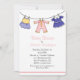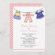Invitation à la douche pour bébé, avec des images de vêtements pour bébé accrochés à une ligne de lavage, contre un arrière - plan blanc. Un rose avec un motif à pois blanc recouvre le dos. Personnalisez tous les champs de texte de votre événement baby shower.