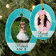 Customisez ce vêtement de Noël bleu avec une photo des deux côtés. Le texte peut être ajouté à la personnaliser avec le ou les nom(s) et âge(s) ou tout texte que vous préférez. Fabriqué en tant que modèle pour tenir des photos de l'enfance et de l'ado années pour une personne, mais peut également tenir des photos de deux enfants séparés, ou jumeaux, tout membre de la famille ou animaux de compagnie. Céramique ovale, avec petits flocons de neige, accrochée à un cordon d'or.