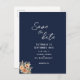 Bleu profond "sauvez la date" pour les mariages, avec fleurs d'abricot aquarelle et feuillage de jardin. Un design botanique contemporain simple mais élégant, inspiré du style boho vintage, avec monogramme sur le dos.