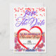 L'invitation présente un grand coeur au centre, symbolisant l'amour et l'engagement. Dans les coins inférieurs, des fleurs délicates apportent une touche d'élégance et de romantisme. Les coins supérieurs sont ornés de petits coeurs, représentant la joie et la célébration.