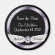 Marquez la date pour vos invités avec cet élégant enregistrer la date mariage aimant en noir, blanc et argent. L'image imprimée présente un cadre rond à l'aspect argenté et un ruban à bijoux pour une touche classe. Graphique de Zaza sur Scraps and Tubes.