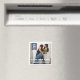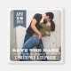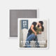 Moderne, mais avec une touche rustique, une photo du beau couple remplit le cadre, et une bannière bleu gris assez raide tient le mois, le jour et l'année de la date mariage. Un aimant de conservation parfait pour faire connaître aux clients la date du fiançailles et du mariage.