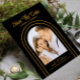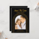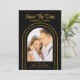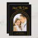 Save The Date Black Gold Stylish Script Art Deco Wedding Cards présente votre photo préférée à l'intérieur d'une arche dorée sur un arrière - plan noir. Personnalisez avec votre texte en modifiant le texte dans les zones de texte fournies. Conçu pour vous par ©Evco Studio www.zazzle.com/store/evcostudio