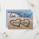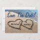"Save The Date!" texte en bleu, ou facilement changer le libellé, est ajouté sur cette belle photo originale de deux coeurs écrits dans le sable le long de l'eau bleue de l'océan pour signifier l'amour et l'amour. Insérez facilement le nom de la mariée et du marié dans le coeur comme indiqué. Les exemples de noms sont écrits dans le style et la couleur de police correspondant parfaitement qui peuvent également être changés facilement. Mettez votre texte personnalisé, les détails et les informations au verso de l'invitation ou laissez simplement vide si vous le souhaitez. Concept idéal pour les futurs fiançailles d'été, mariages, anniversaires, et enregistrer la date invitations et annonces pour le couple heureux.