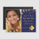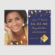 Sur le devant : Ajoutez votre propre photo verticale de taille du diplômé. Un fond bleu marine chic, décoré d'étoiles dorées factices. Personnalisez et ajoutez un nom et une date. Lettres dorées. Le nom et le texte : Enregistrez la date sont écrits avec un style de lettre manuscrite moderne.