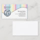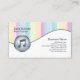 Ce carte de visite d'enseignant de musique dispose d'un arrière - plan blanc en forme de vague où votre nom d'entreprise et vos coordonnées apparaissent. Votre nom et votre titre apparaissent sur la partie supérieure où des rayures pastel colorées se trouvent dans l'arrière - plan. Une icône circulaire de note de musique grise et brillante se trouve dans la partie inférieure gauche de la carte. Ce design donne une première impression joyeuse et lumineuse. Parfait pour les entreprises liées à la musique ou le divertissement. Customisez cette carte immédiatement avec votre nom et vos coordonnées.