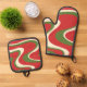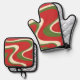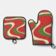 Ensemble super Retro Motif de Noël Escalier Mitt & Pot Pot. Festif, trippy, tourbillonnant, ondulé design abstrait de vacances de Noël dans les couleurs traditionnelles de Noël : rouge, vert olive et crème. Idéal pour les fêtes de vacances ou comme cadeau pour le cuisinier à tout moment. Par Kierkegaard Design Studio.