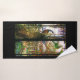 La reproduction vintage magnifique de fenêtre en verre teinté de Nouveau Tiffany d'art des oiseaux de paon et de perroquets dans une volière complètement des glycines et d'autres fleurs et baies, avec un voilier en dehors de la navigation à l'arrière-plan, est sur cet ensemble de serviette de Bath. L'image est public domain dû à copyright expiré.