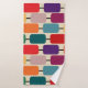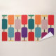 Ce kit de serviettes est doté d'une serviette de bain Bauhaus aux motifs de rectangles arrondis entrecoupés de rangées, d'un linge rouge et d'une serviette à main violette.