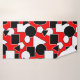Ce kit de serviettes est muni d'un linge rouge, d'une serviette blanche et d'une serviette de bain avec un modèle Bauhaus de triangles, cercles, rectangles et pentagons en noir et blanc sur un champ de rouge.