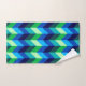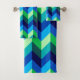 Un ensemble de serviettes de bain avec un design motif coloré et sombre de chevrons en vert citron, bleu royal turquoise, bleu océan et bleu ciel.