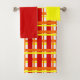 Ce kit de serviettes est muni d'un linge jaune, d'une serviette de bain rouge et d'une serviette de bain de style Art déco, d'un plan aux lignes épaisses et fines en rouge, orange et jaune.