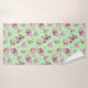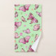 Un Motif De Papillons Roses Se Trouve Sur Une Serviette De Bain Arrière - plan Verte, Qui Offre Un Décor De Salle De Bains Complet.