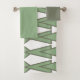 Ce kit de serviettes est doté d'un linge vert sauge, d'une serviette de bain vert clair et d'une serviette de bain avec un design art déco de triangles et de diamants qui ressemblent à des corps en vert clair et vert sage.