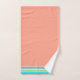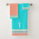 Serviette de bain d'inspiration sud-ouest sertie en corail, turquoise, orange, vert et rose. La serviette à main orange et le linge de toilette et la serviette de bain turquoise ont des graphismes d'un ruban motif tribal coloré, le long du bord des serviettes. Personnalisez le monogramme blanc à lettre simple, sur la serviette de bain, pour répondre à vos besoins.