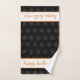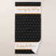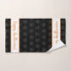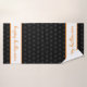 Cet ensemble de bain a un motif de toiles d'araignées grises sur un arrière - plan noir. Au bas de la conception il y a une bannière blanche avec le texte qui dit, Happy Halloween.