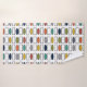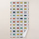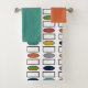 Ce kit de serviettes est doté d'une serviette de bain au design moderne du milieu du siècle avec des rectangles et ovales répétitifs aux couleurs rétro, un linge orange et une serviette à main turquoise.