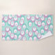 Ce set de serviettes est doté d'une serviette de bain avec un motif d'ovales éparpillés dans le turquoise et le violet avec des ovales blanches et des cercles avec des lignes à l'intérieur, un linge turquoise et une serviette à main violette.