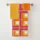 Ce kit de serviettes est muni d'un linge orange, d'une serviette de bain jaune et d'une serviette de bain aux motifs géométriques de L en rouge, orange et jaune, placée dans des directions différentes sur un champ de blanc.