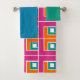 Ce kit de serviettes est doté d'un linge vert, d'une serviette bleue à main et d'une serviette de bain au design géométrique Ls dans différentes directions qui se répètent à travers le design.