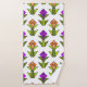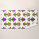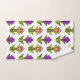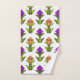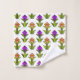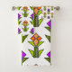 Ce kit de serviettes a un design art déco fait de diamants, triangles et polygones qui fabriquent des tulipes en orange et violet avec des tiges vertes et des feuilles.