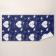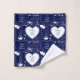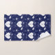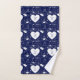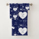 Serviette de bain conçue avec deux noms de motif valentin, blanc sur bleu marine. Customisez les serviettes avec vos noms de coeur, couleur arrière - plan, entre autres options.