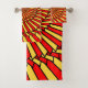 Cette scénographie de serviette comporte un motif de spirale ou de remous avec des couleurs comme le rouge et le jaune. [~Z0000105]