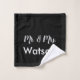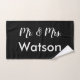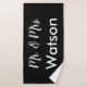 Cette serviette de bain en noir et blanc dit "Mr. & Mme en écriture blanche. L'ensemble peut être personnalisé avec le nom du couple.